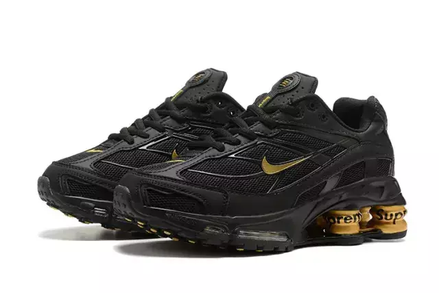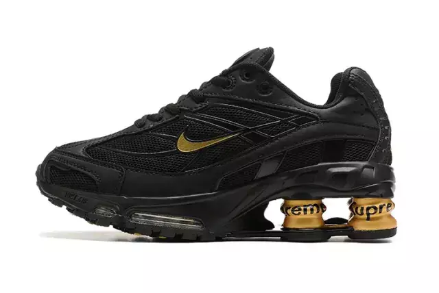 Seu acabamento em preto com detalhes em dourado confere um visual sofisticado e moderno, perfeito para quem quer se destacar nas ruas com autenticidade. Desenvolvido para proporcionar suporte e estabilidade, o Nike Shox R2 x Supreme é ideal para uso diário e atividades físicas.